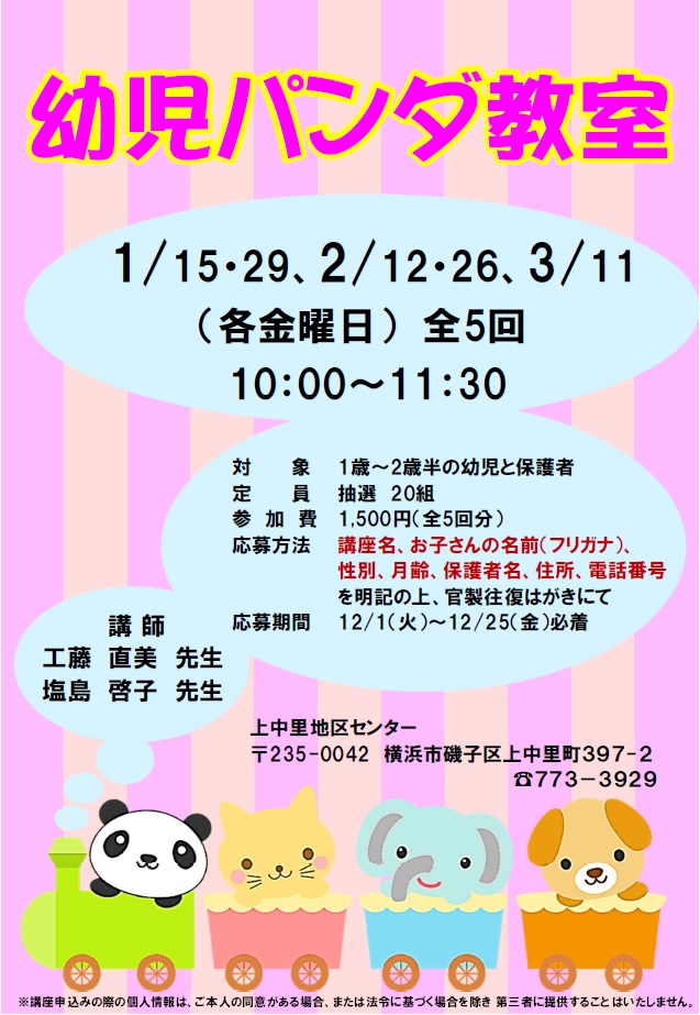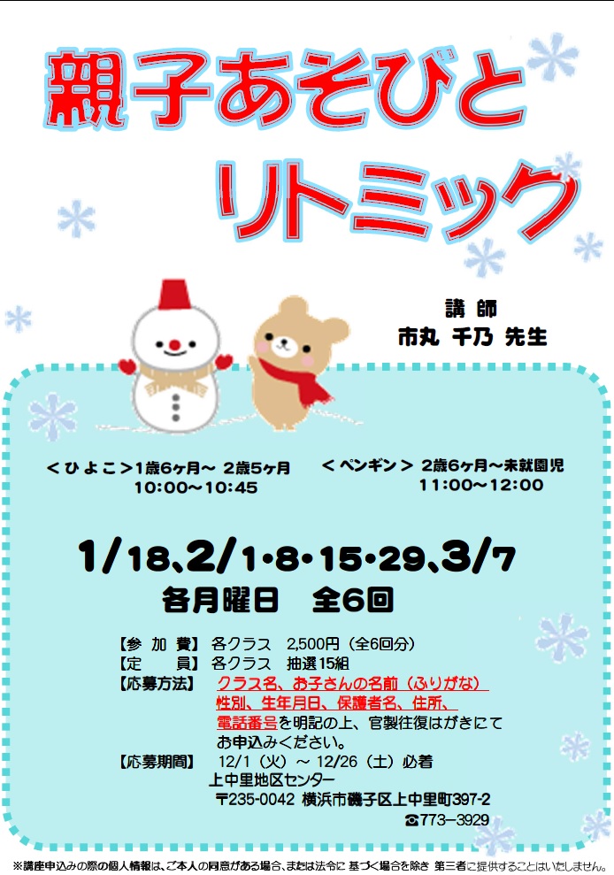 講座名、お子さんの氏名(フリガナ)、性別、月齢、住所、電話番号、同伴する保護者の氏名を明記の上、往復はがきにて