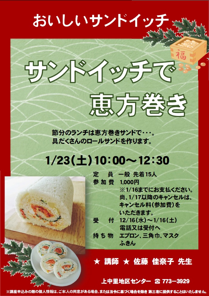 - 持ち物:エプロン、三角巾、マスク、ふきん