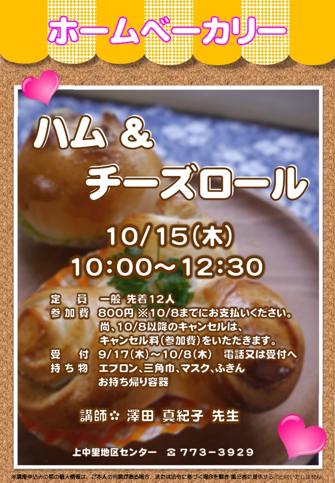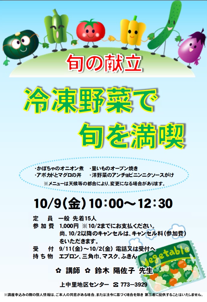 - 持ち物:エプロン、三角巾、マスク、ふきん、持ち帰り容器
