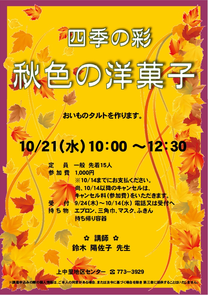 9/24(木)~10/14(水)電話または受付へ