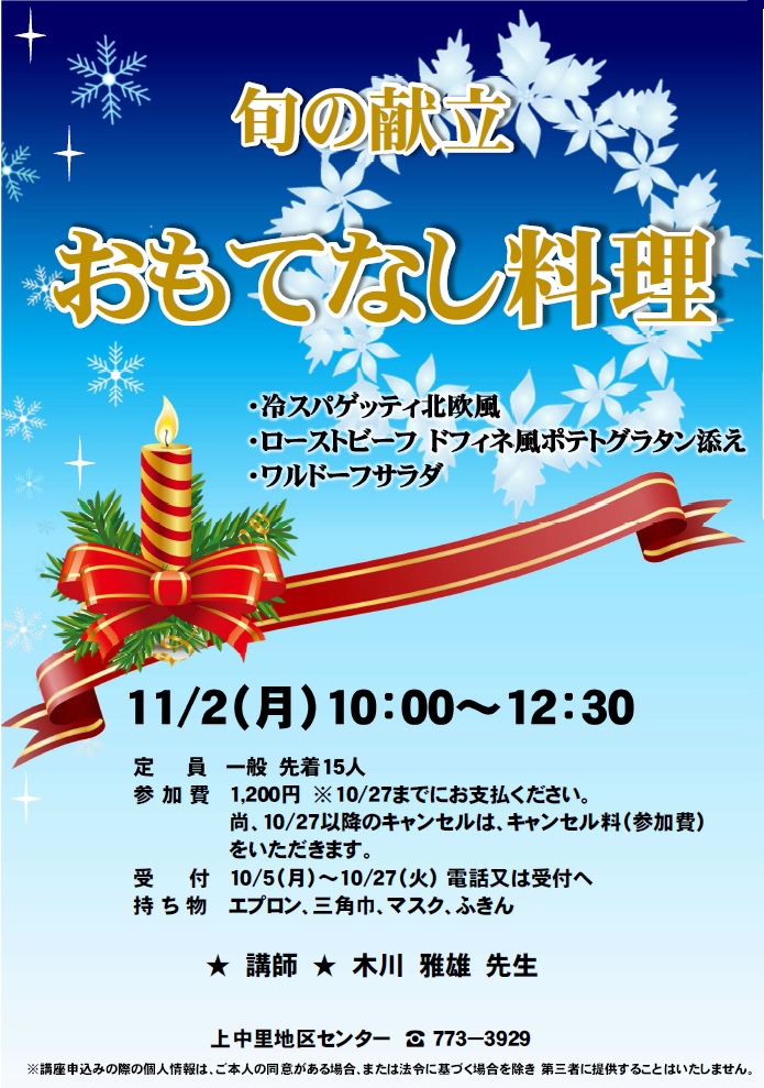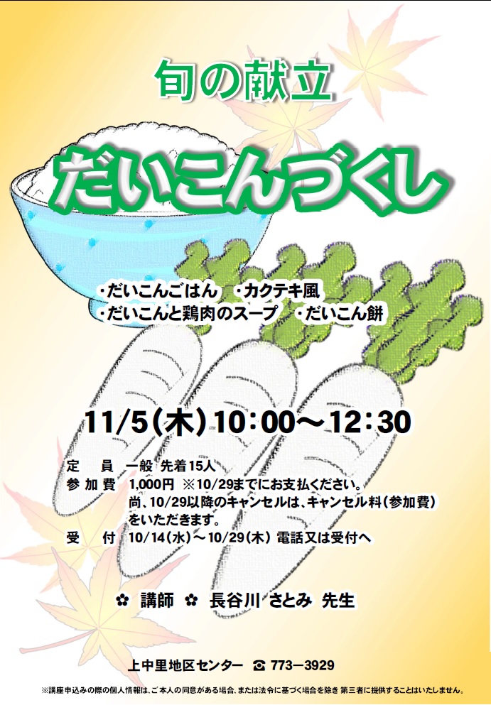 - 持ち物:エプロン、三角巾、マスク、ふきん、持ち帰り容器