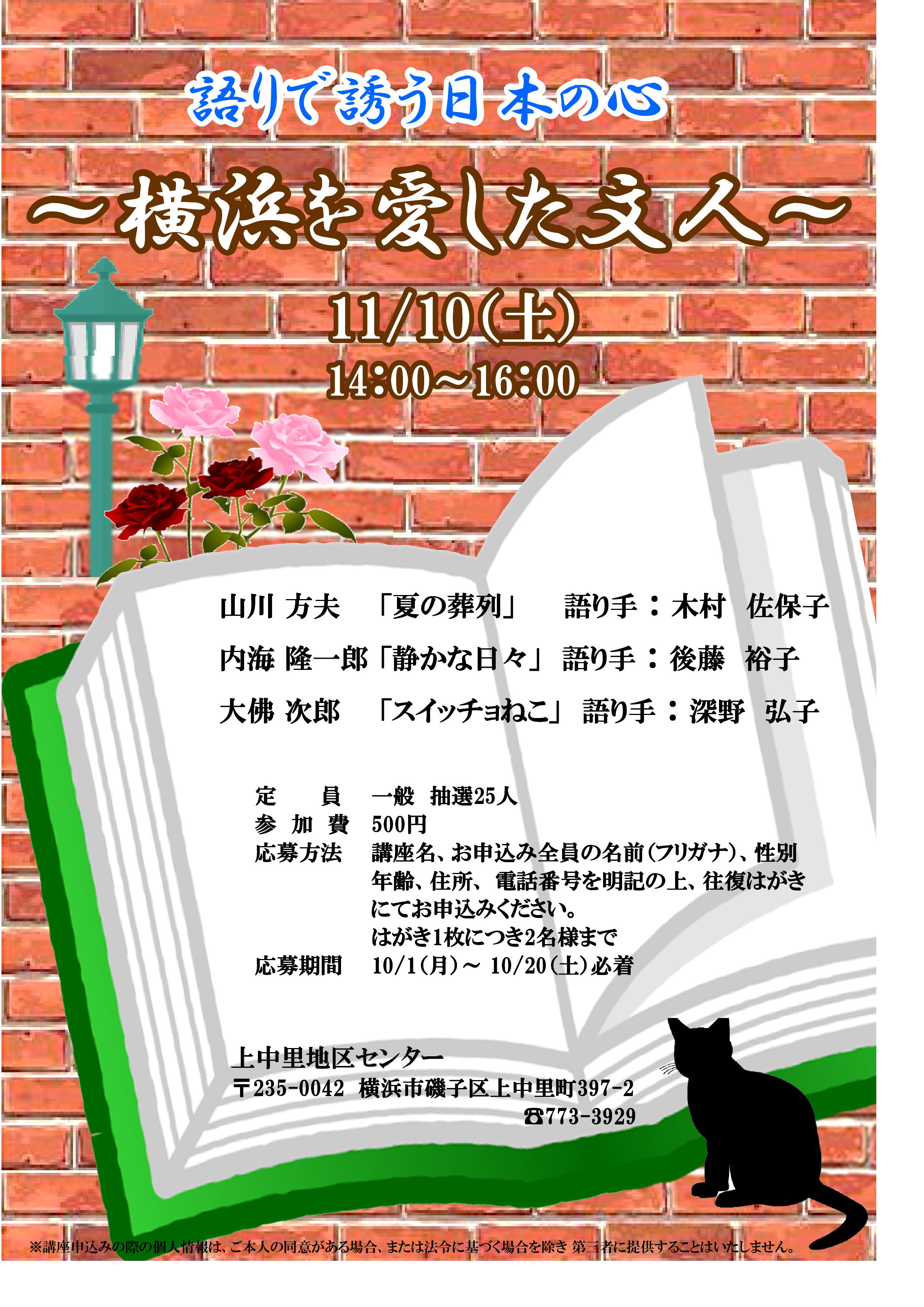 横浜を愛した文人たちの中から、大佛次郎、山川方夫などの3作品を選び、臨場感あふれる素朴な語りでお聞かせします。