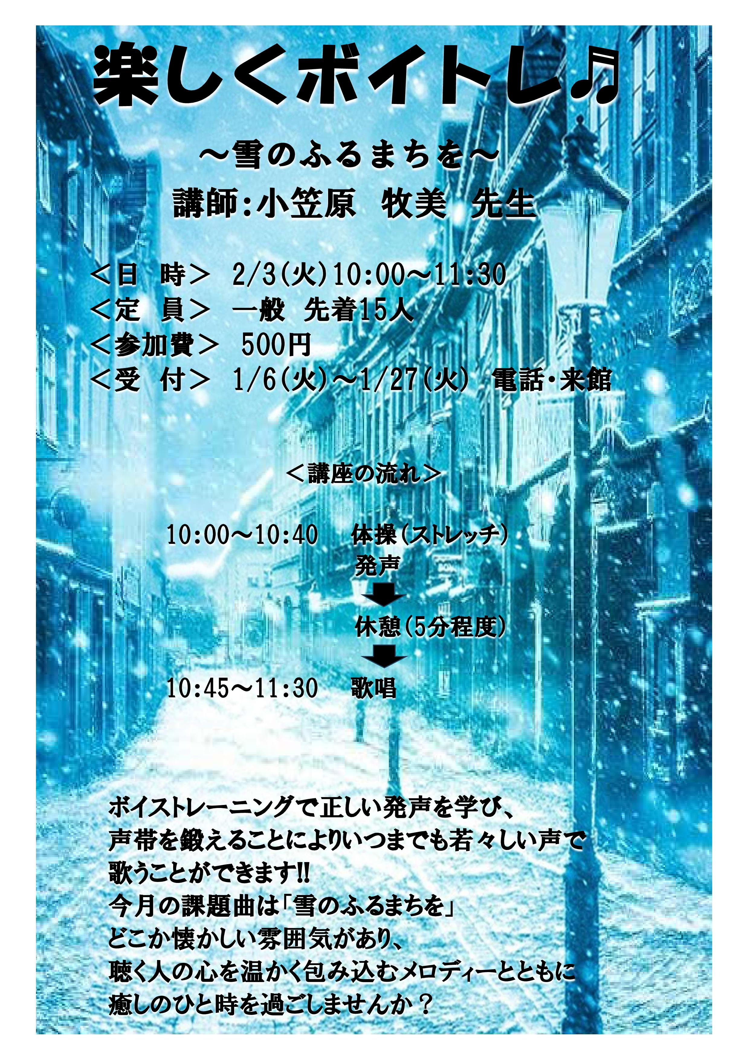 正しい発声を楽しく学びながら、毎回その月の課題曲を歌います。声を出すことによりストレスが発散され精神の健康を保つことができます。いつまでも若々しい声でうたいましょう!!今月の課題曲は「雪のふるまちを」です。聴く人の心を温かく包み込むメロディーとともに癒しのひと時を過ごしませんか?