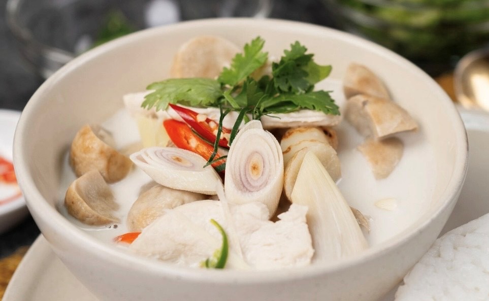 スパイス(生姜、レモングラスなど)と酸味の効いたココナッツミルクのスープです。