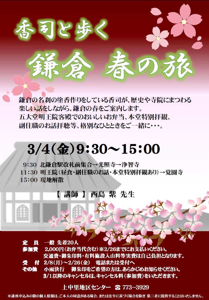 鎌倉の名刹の塗香を作っている香司が、歴史や寺院にまつわる楽しい話をしながら、鎌倉の春をご案内します。