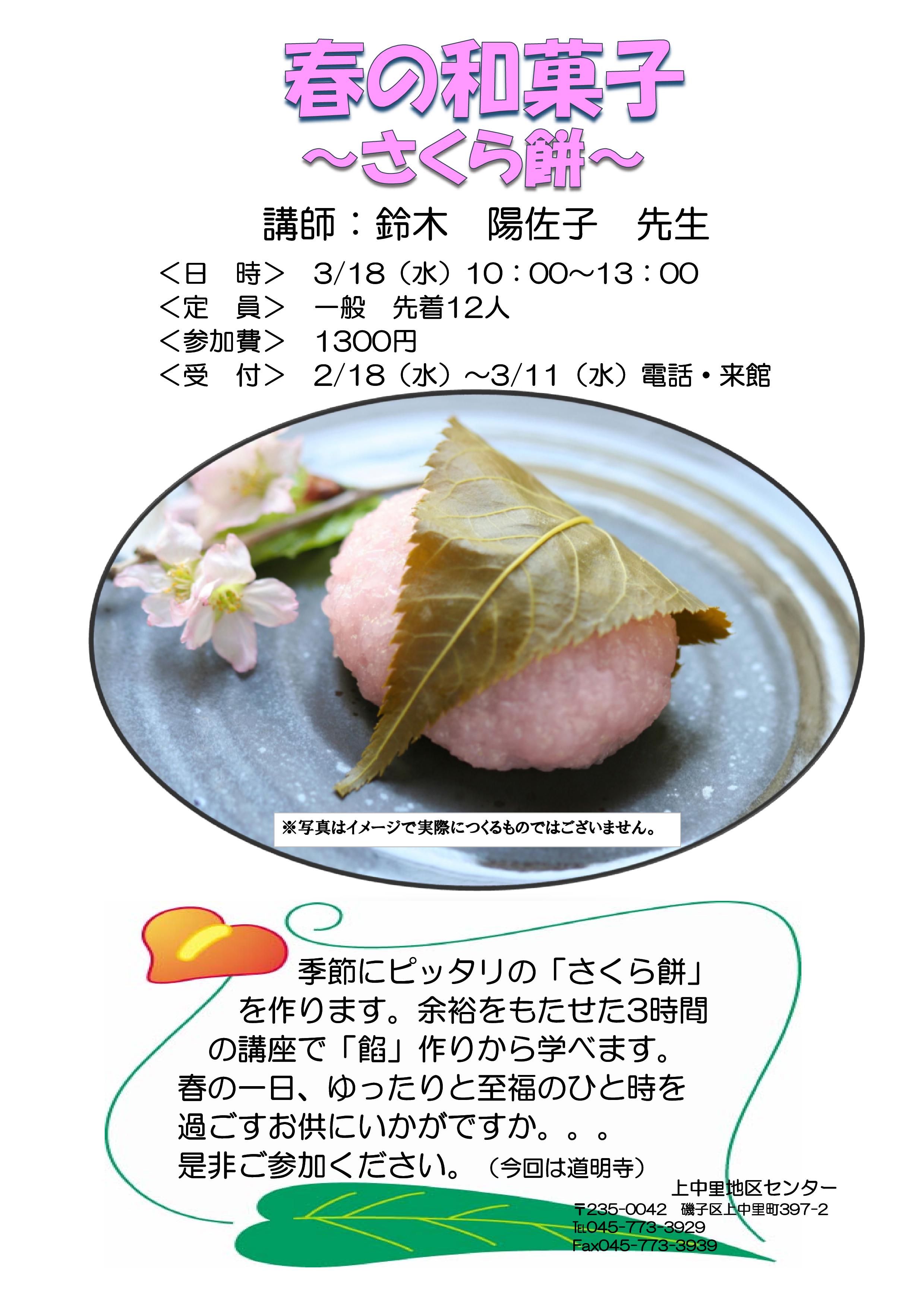 季節にピッタリの「さくら餅」を作ります。今回は道明寺です。余裕をもたせた3時間の講座で「餡」作りから学べます。