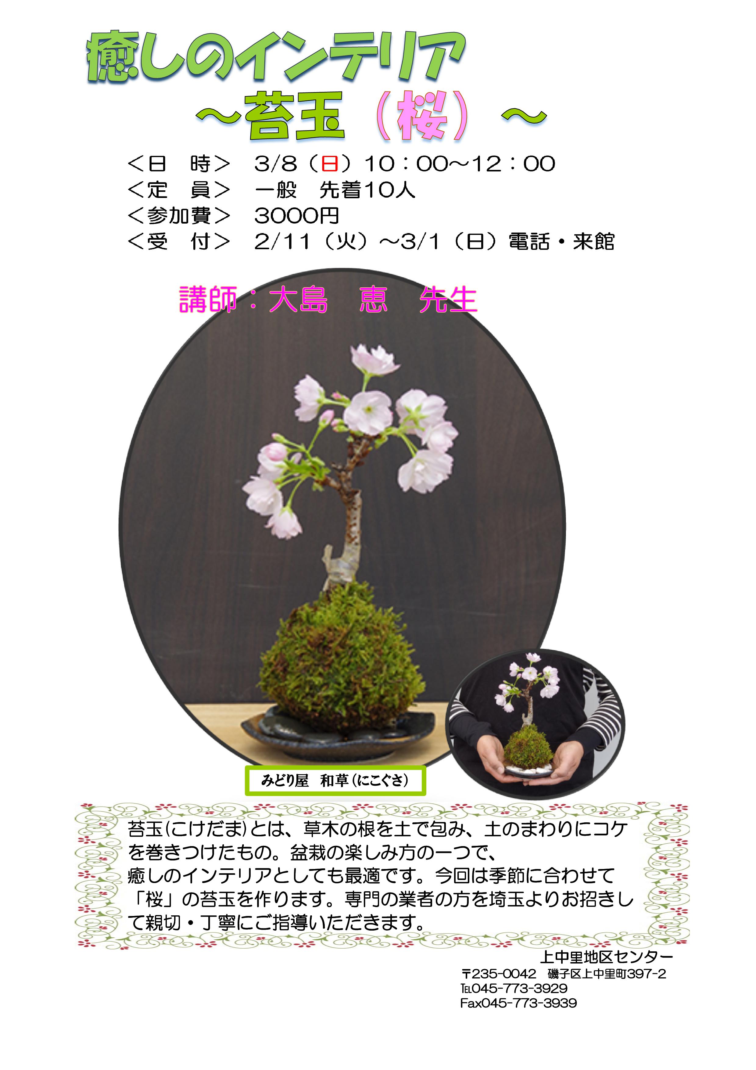 癒しのインテリアとしても最適です。今回は季節に合わせて「桜」の苔玉を作ります。専門の業者の方を埼玉よりお招きして親切・丁寧にご指導いただきます。
