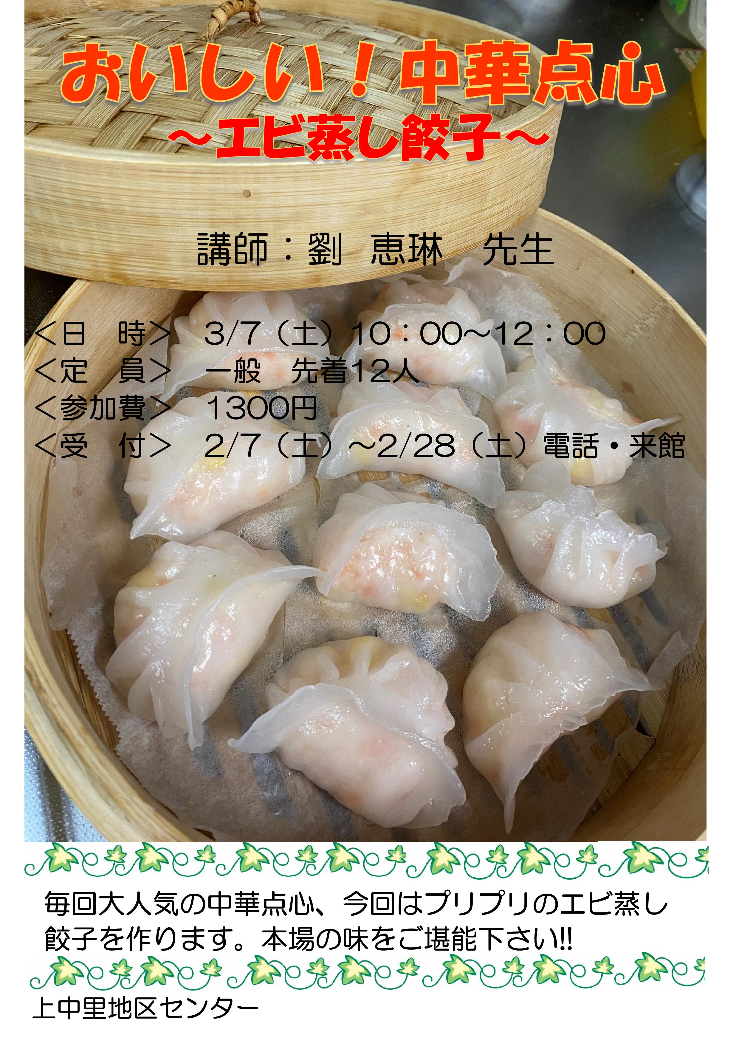 毎回大人気の中華点心、今回はプリプリのエビが食欲をそそる蒸し餃子を作ります。皮の包がなかなか難しいですが、チャレンジしてみましょう!!