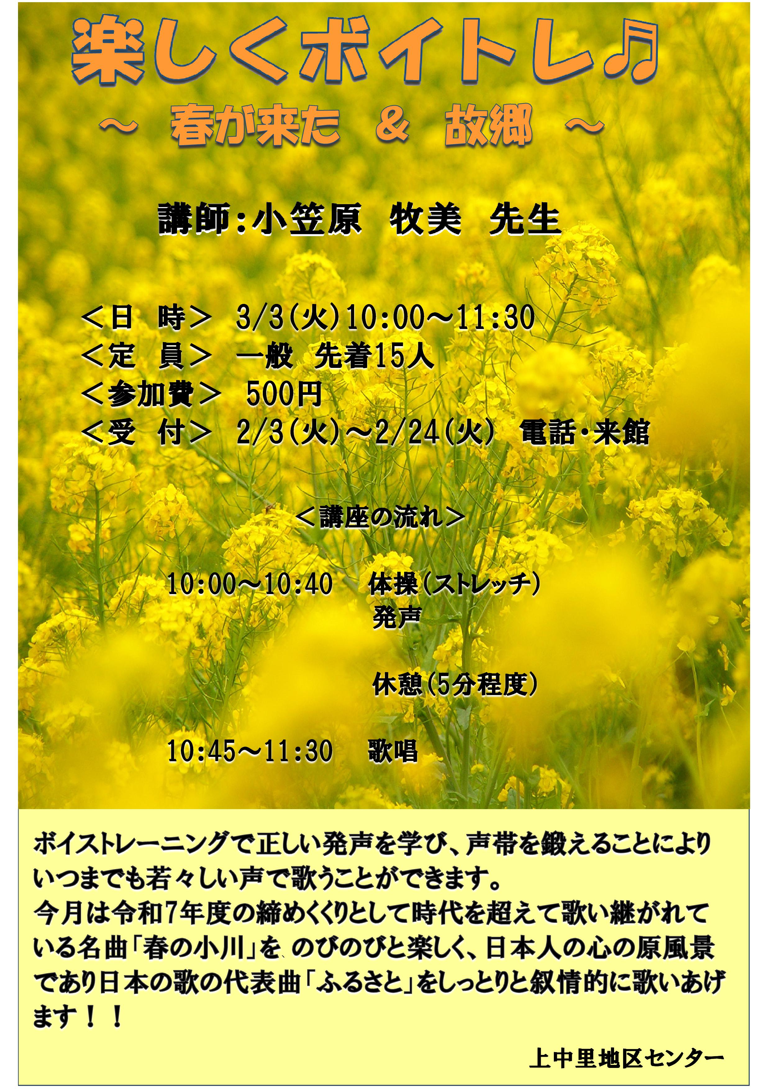 人間の声帯は25歳がピークであとは徐々に衰えていく。ボイストレーニングをすることによりその速度を遅くすることが可能となる。正しい発声を学びながら、いろいろな歌を歌い、声を出すことによりストレスを発散させ精神の健康を保ちましょう!今月の歌は春が来た&故郷です。