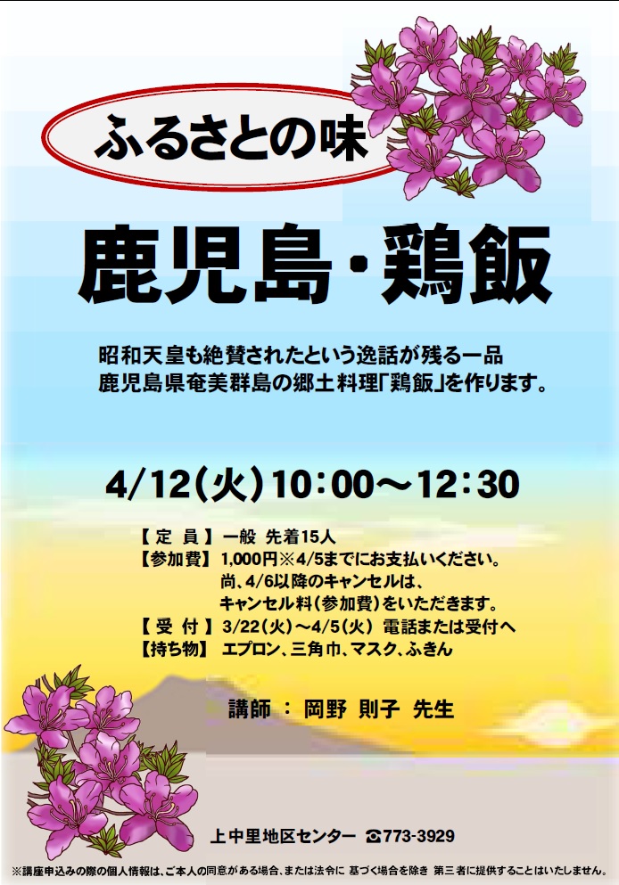 - 持ち物:エプロン、三角巾、マスク、ふきん