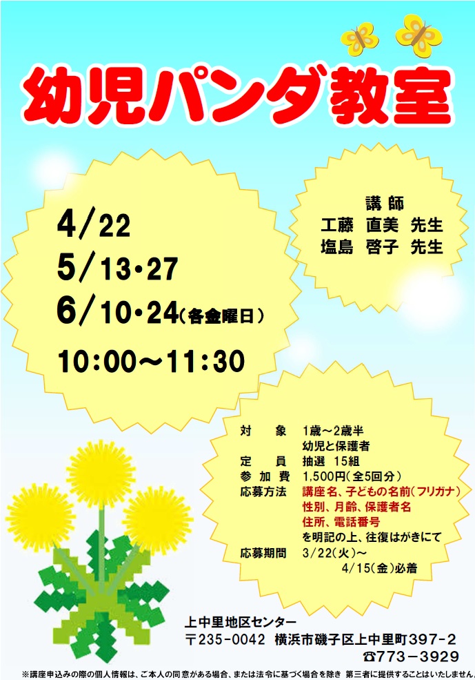 講座名、お子さんの氏名(フリガナ)、性別、月齢、住所、電話番号、同伴する保護者名を明記のうえ、往復はがきにて