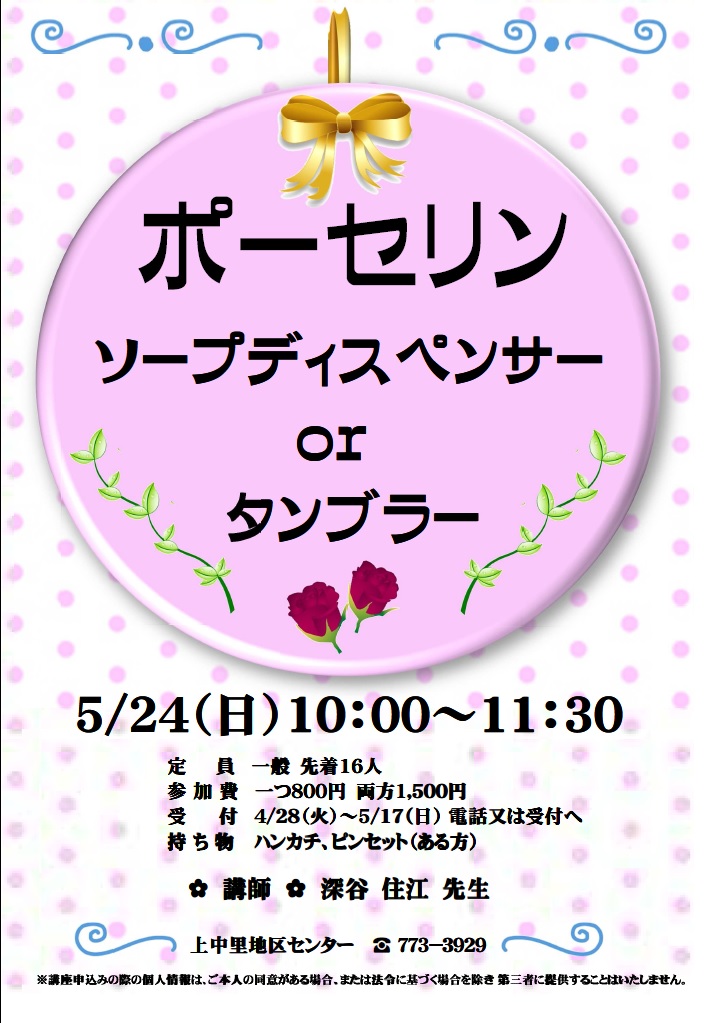 - 4/28(火)~5/17(日)電話または受付へ