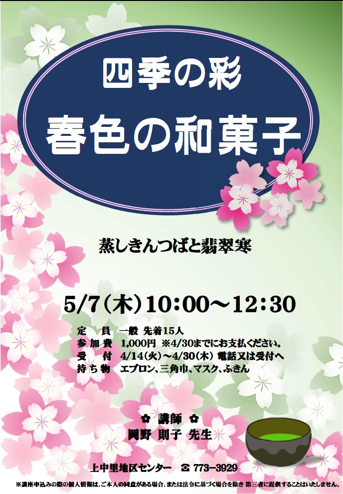 - 4/14(火)~4/30(木)電話または受付へ