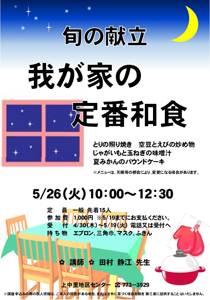 - 持ち物:エプロン、三角巾、マスク、ふきん