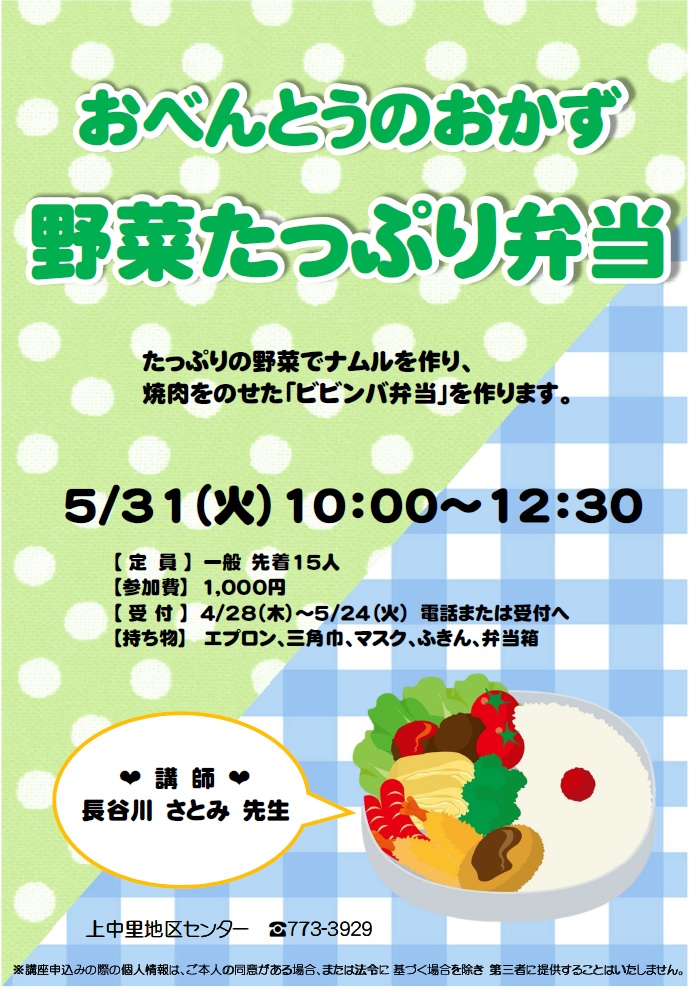 - 持ち物:エプロン、三角巾、マスク、ふきん、弁当箱