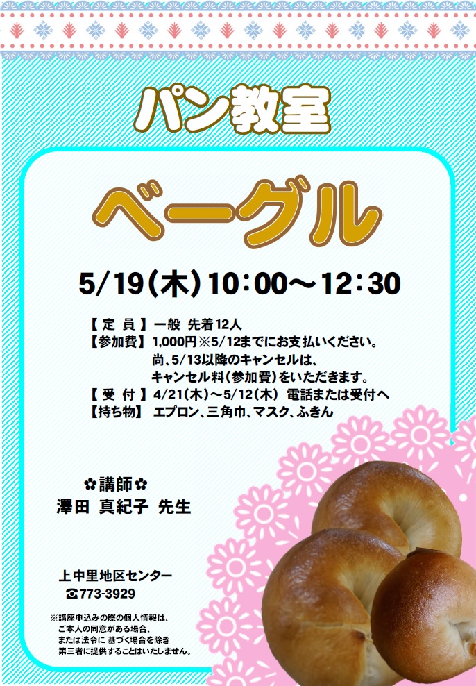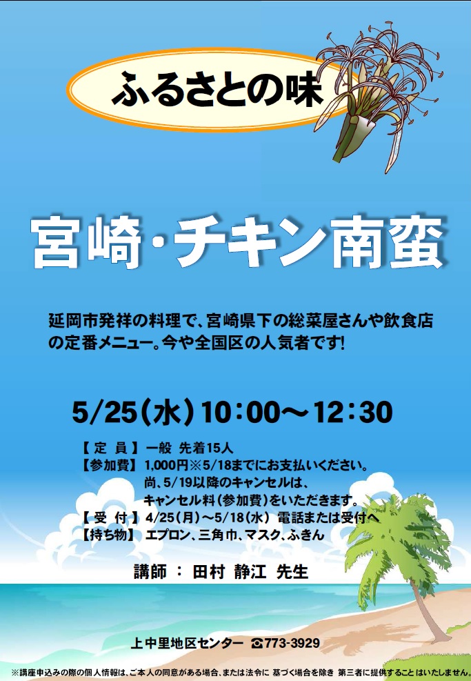 - 持ち物:エプロン、三角巾、マスク、ふきん、持ち帰り容器