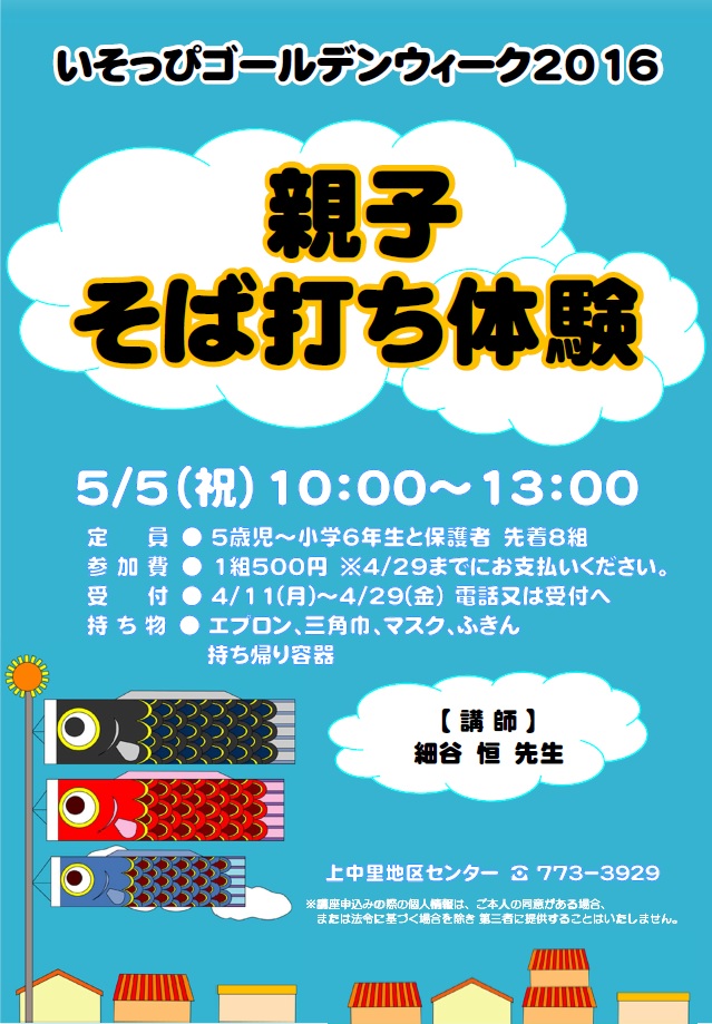 そば打ち名人のご指導のもと、親子でそば打ちを楽しみます。