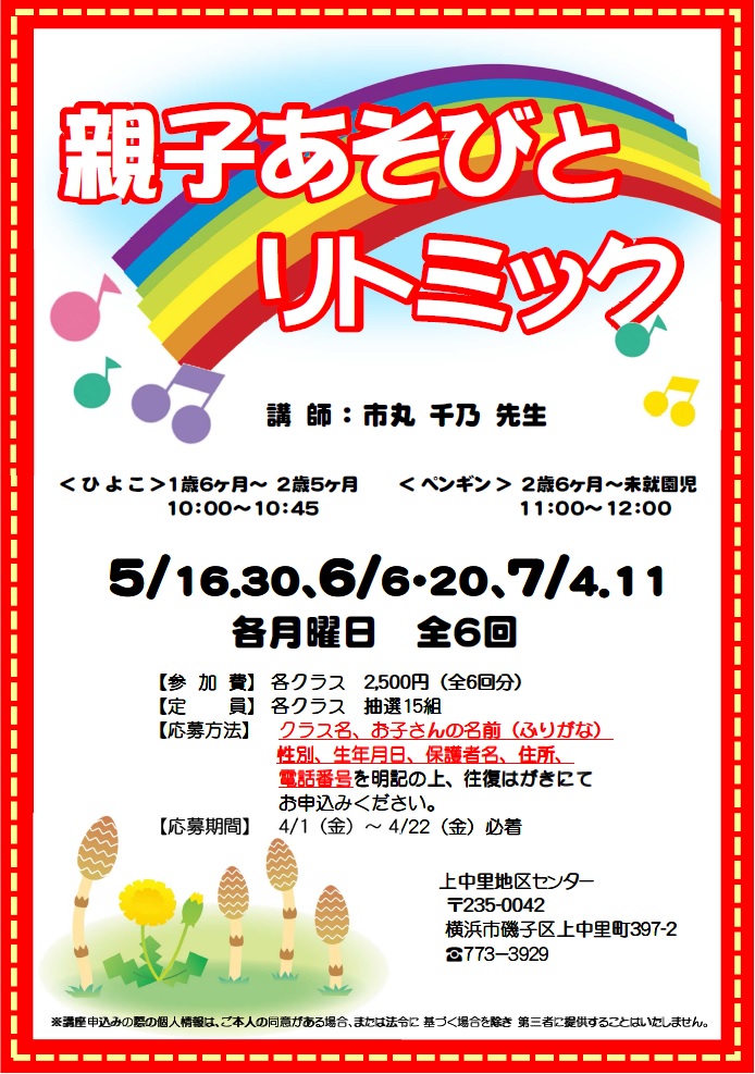 - ひよこクラス・・・1歳6ヶ月~2歳5ヶ月の幼児と保護者