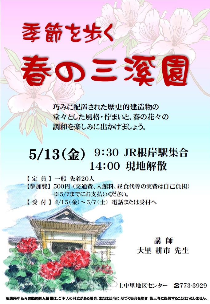 歴史的価値の高い建造物が巧みに配置された三溪園を散策し、その堂々とした風格、佇まいと、春の花々の調和を楽しみます。