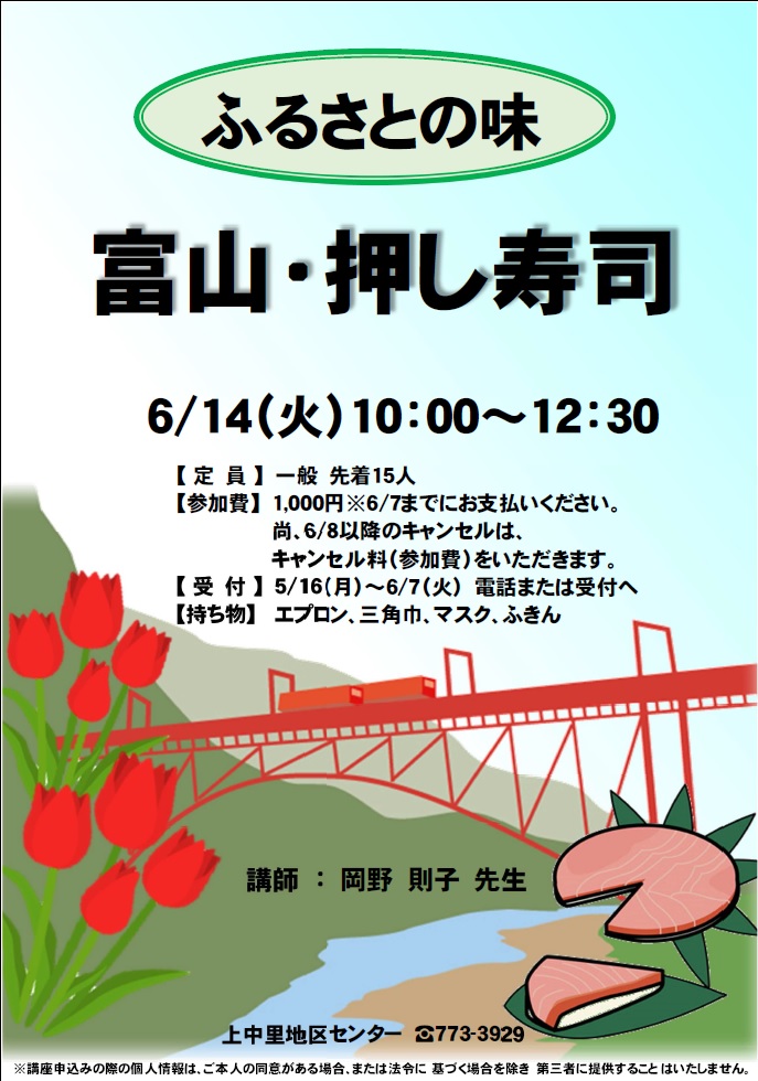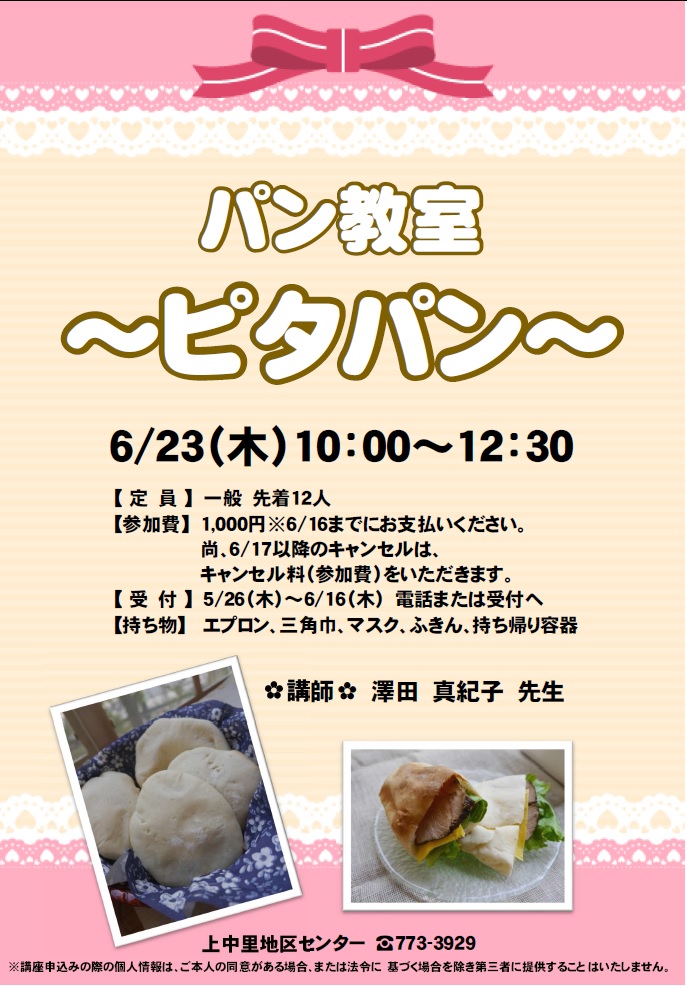 - 持ち物:エプロン、三角巾、マスク、ふきん、持ち帰り容器