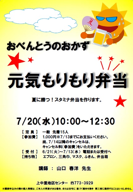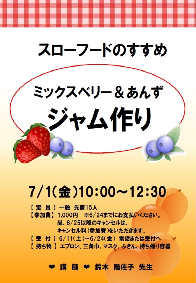 - 持ち物:エプロン、三角巾、マスク、ふきん、持ち帰り容器