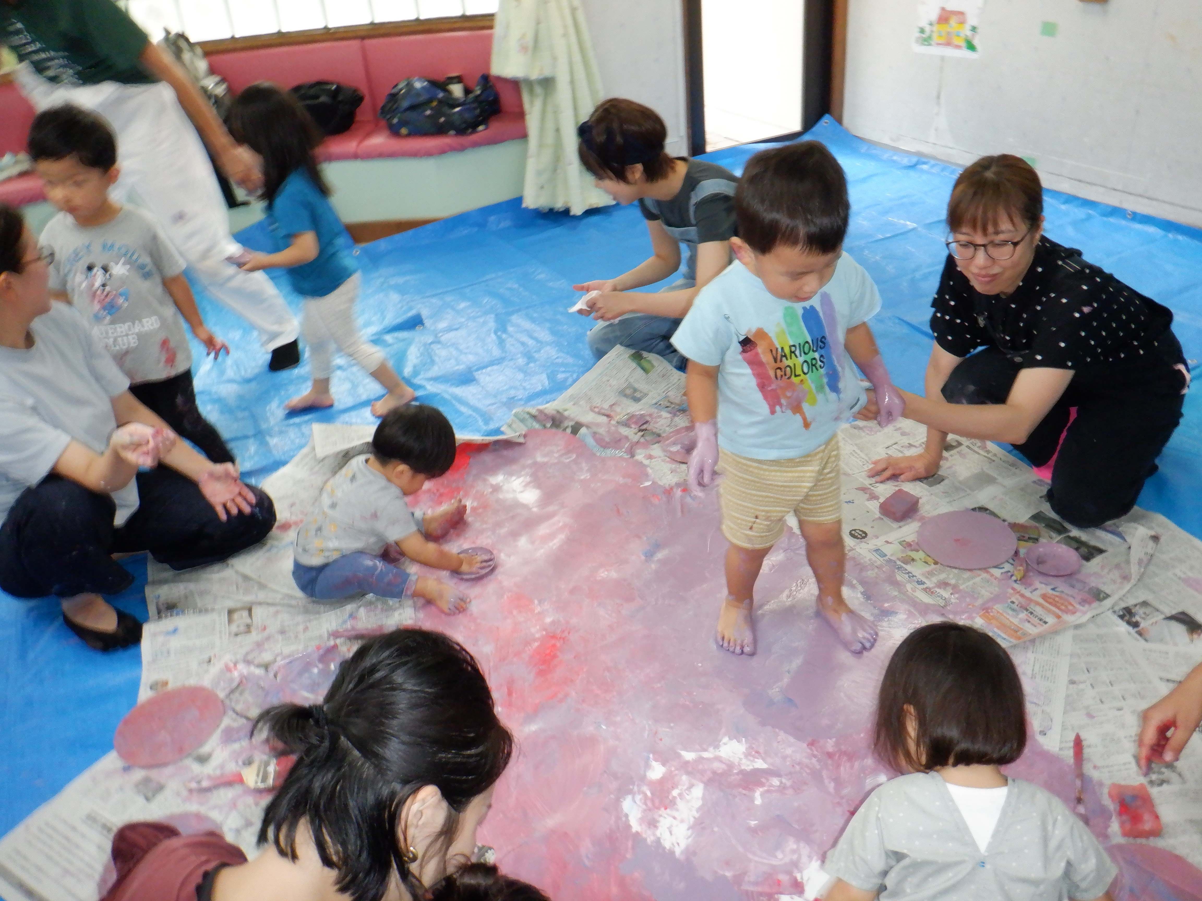 お家ではなかなか体験できない手、足、諸々、使ってペイントして作品をつくるなど、子供の自由な発想をじゃませず、のびのびと思いっきり遊ばせましょう!