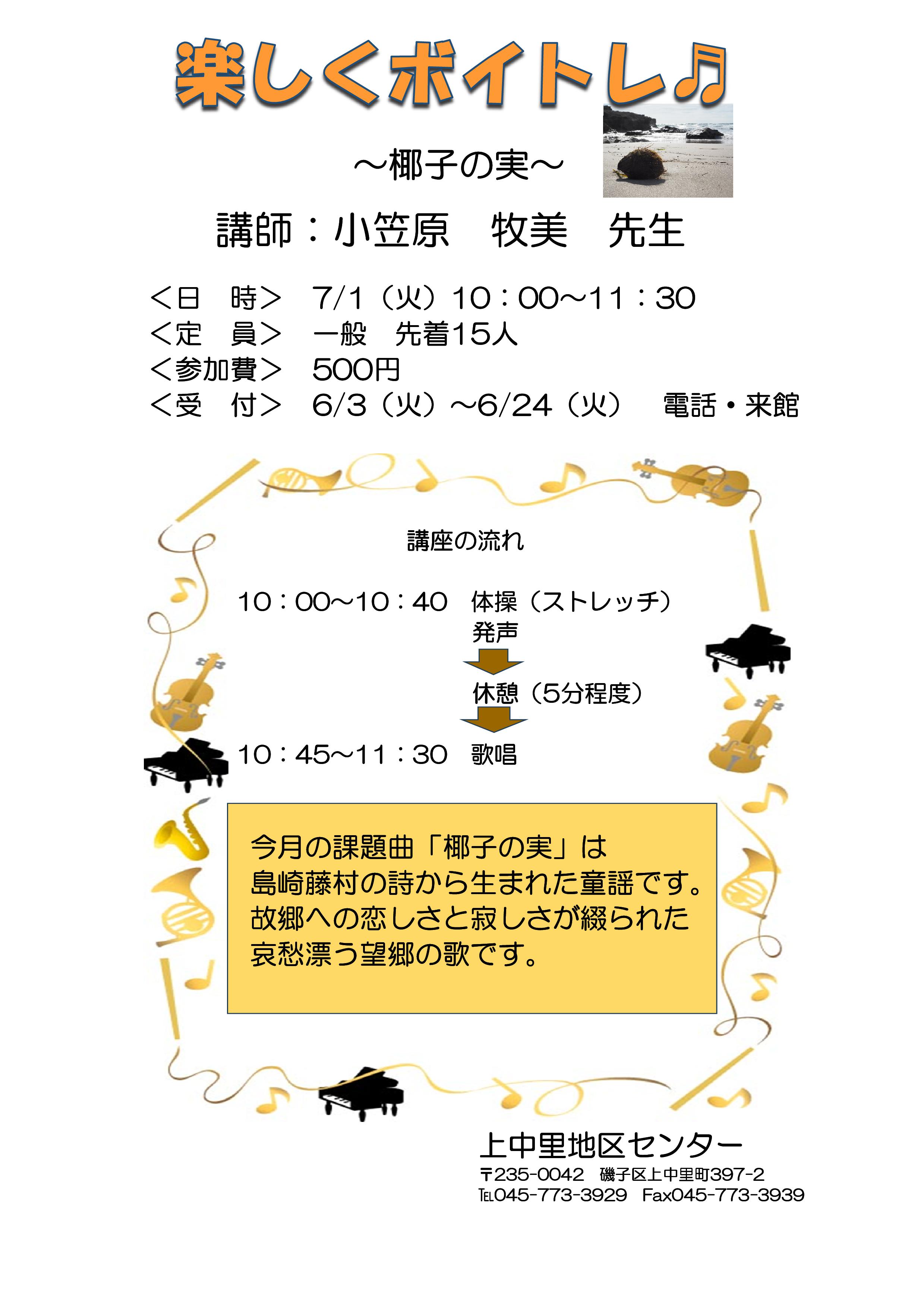 正しい発声を学びながら、いろいろな歌を歌います。声を出してストレスを発散させ精神の健康を保ちましょう!
