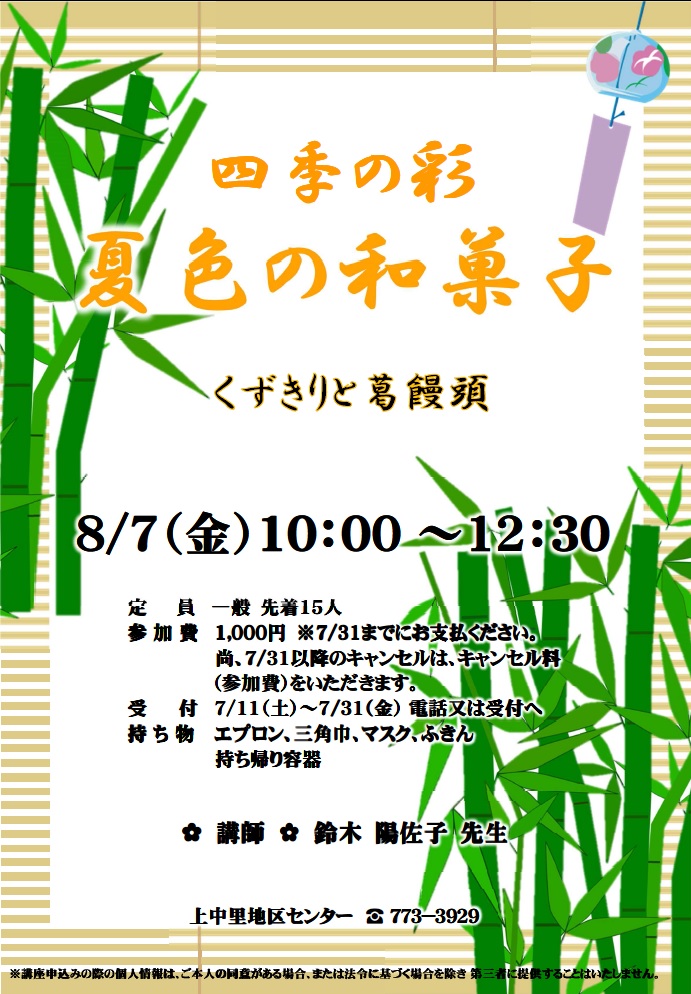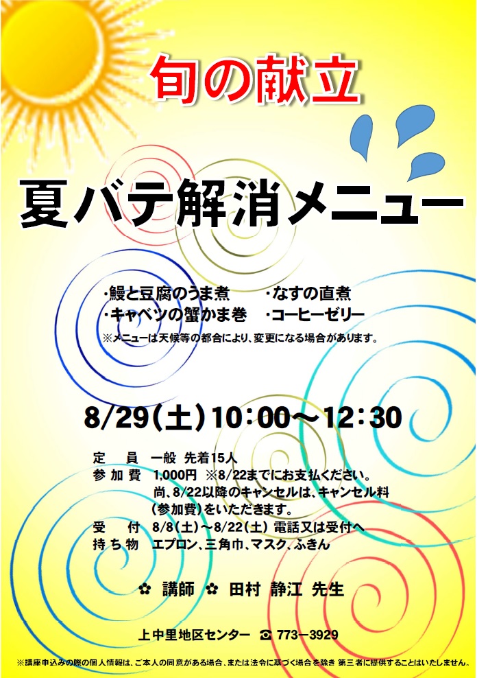 - 持ち物:エプロン、三角巾、マスク、ふきん、持ち帰り容器