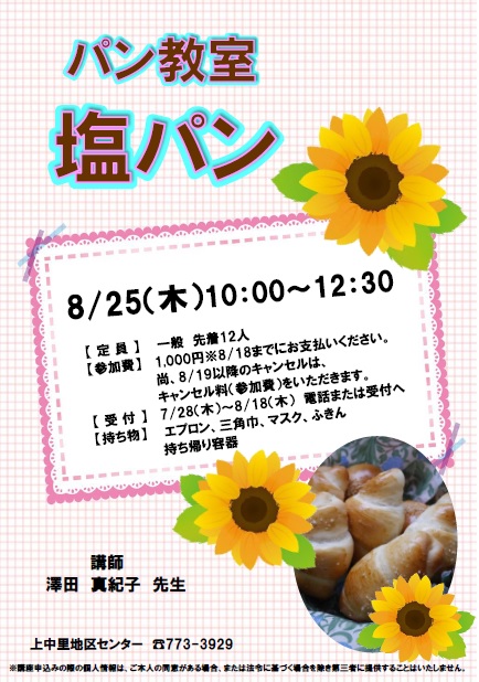 - 持ち物:エプロン、三角巾、マスク、ふきん、持ち帰り容器