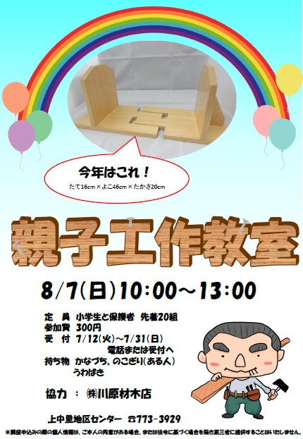 - 持ち物:かなづち、のこぎり(お持ちの人)、上履き