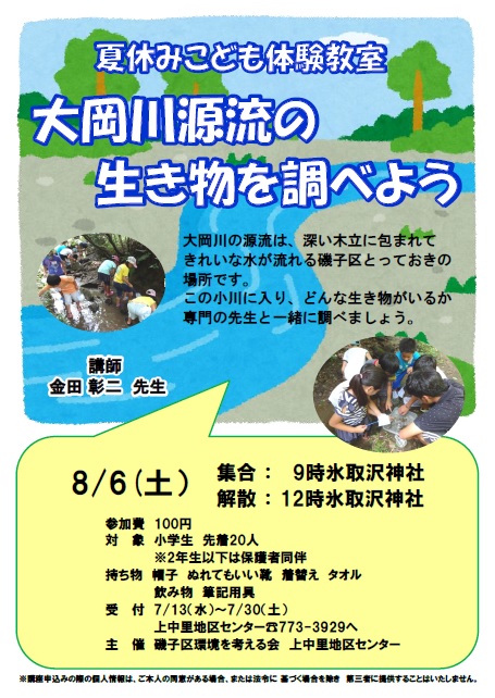 深い木立に包まれて、きれいな水が流れる大岡川の源流に入り、どんな生き物がいるか・・・専門の先生と一緒に調べましょう。