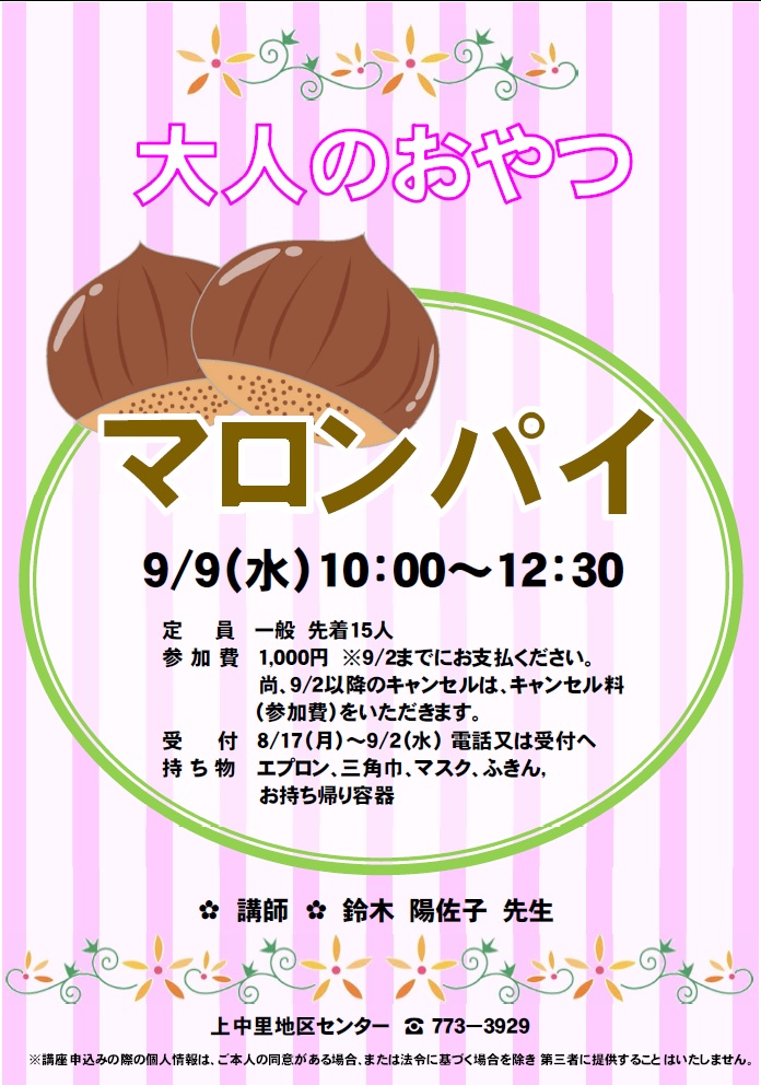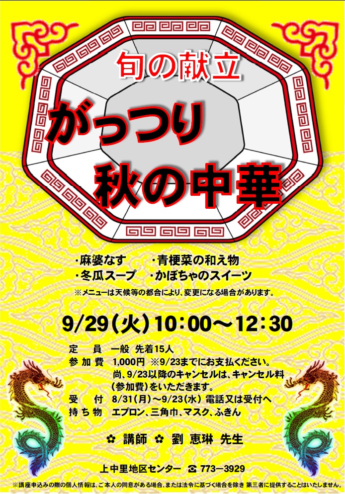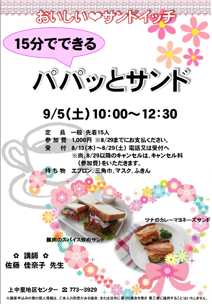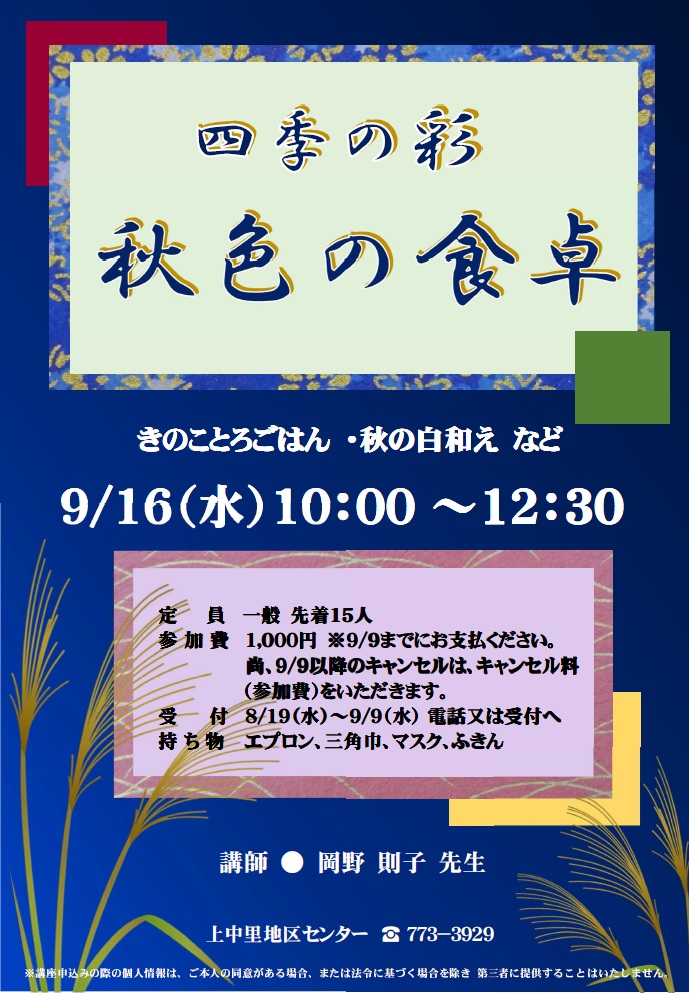 - 持ち物:エプロン、三角巾、マスク、ふきん、お持ち帰り容器