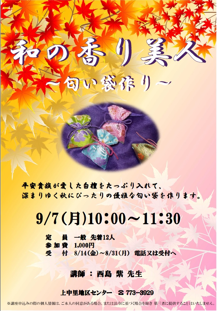 平安貴族が愛した白檀をたっぷり入れて、深まりゆく秋にぴったりの優雅な匂い袋を作ります。