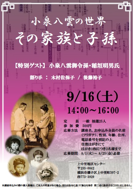 小泉八雲のご令孫・稲垣明男氏をお迎えし、小泉八雲の遍歴や家族について、子孫に受け継がれたものなどをお話いただきます。