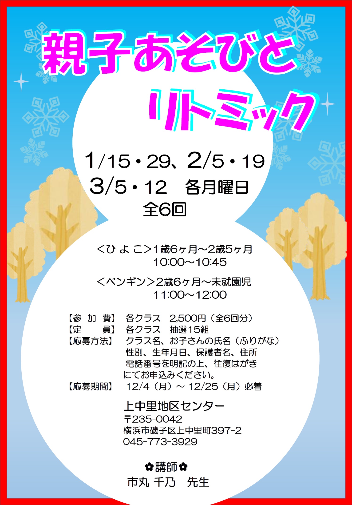 クラス名、子どもの氏名(フリガナ)、性別、生年月日、参加する保護者名、住所、電話番号を明記の上、往復はがきにてお申し込みください。