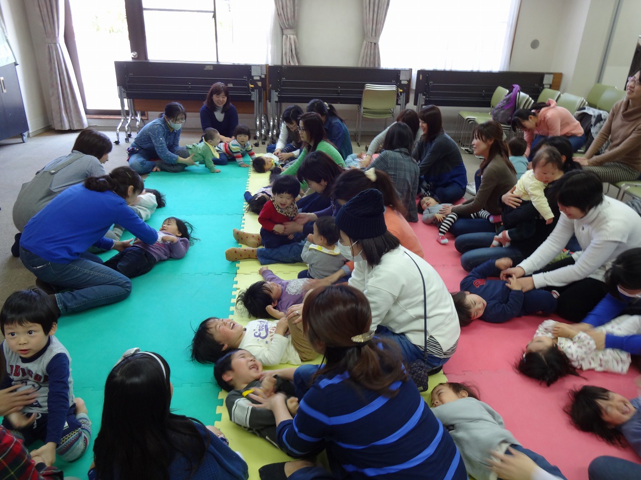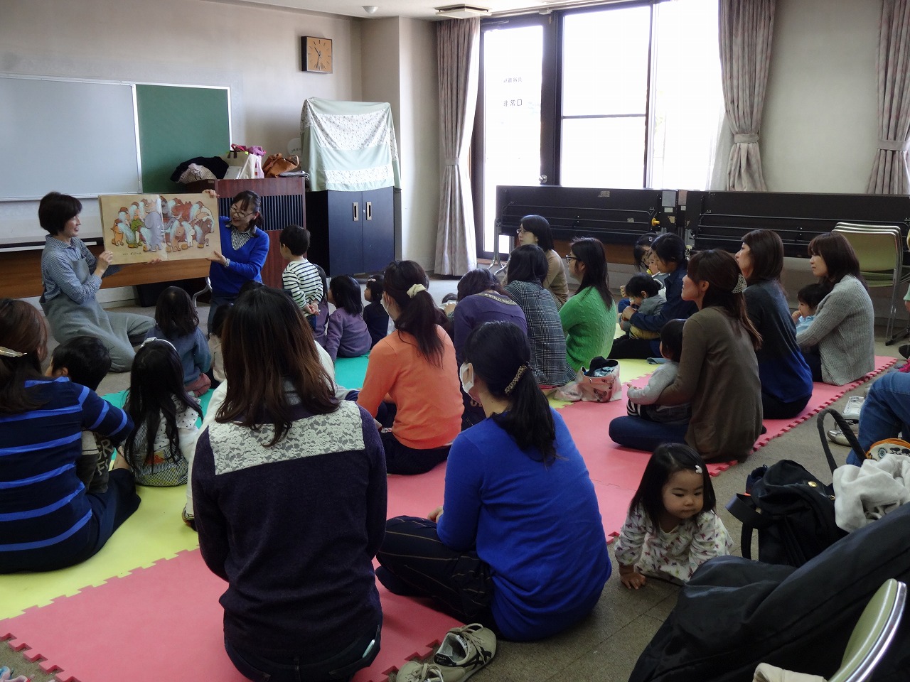 たくさんのお友だちとママに参加していただき、おっきなおっきーな絵本の読み聞かせと手あそびで親子の楽しい時間を過ごしました。