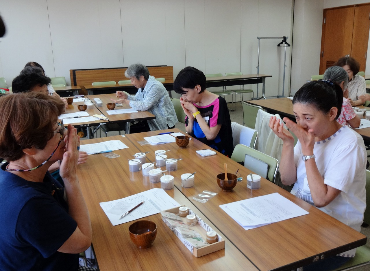白檀を主原料に、ひとつ加えるごとに変化する香りを楽しみながら、先生の分量目安を参考に調合していきます。
