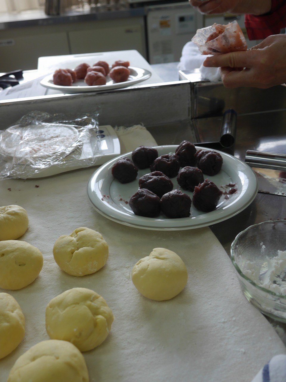 今日は2人1組になり、桜あんぱんと小倉あんぱんの二種類を作りました。