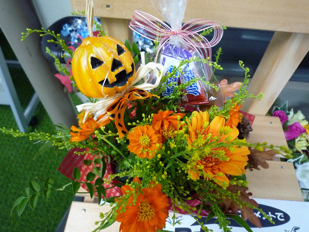 もうすぐ、ハロウィンですね。 秋のお花を使ってとってもかわいらしい アレンジメントができました。 かわいいカボチャも飾っています。