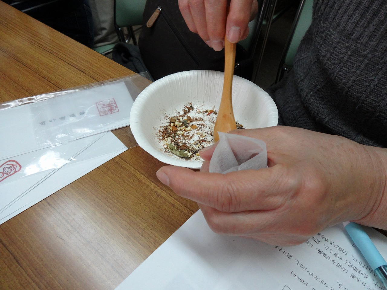 基本処方を参考に、スプーンできっちり量をはかりながら調合し、3包の屠蘇散ができました。