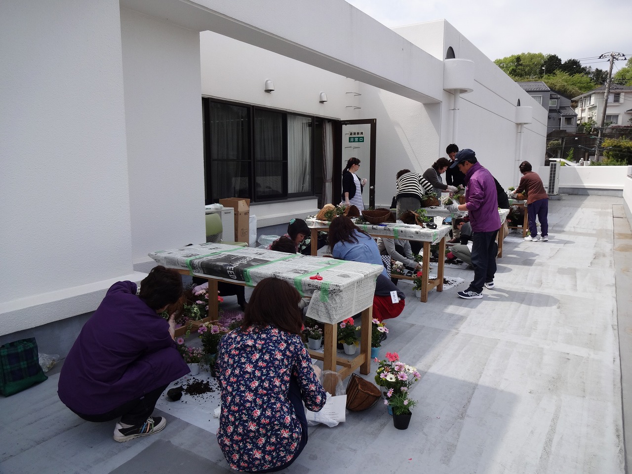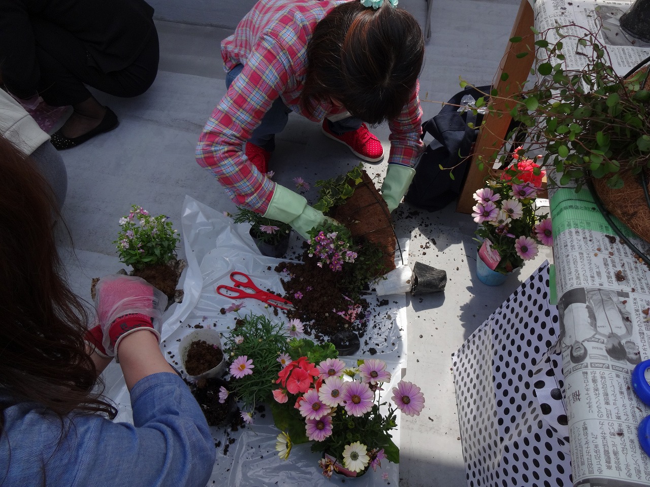 少し肌寒さが残りながらも、春の優しい日差しが降り注ぐ中、バルコニーでハンギング講座が開催されました。