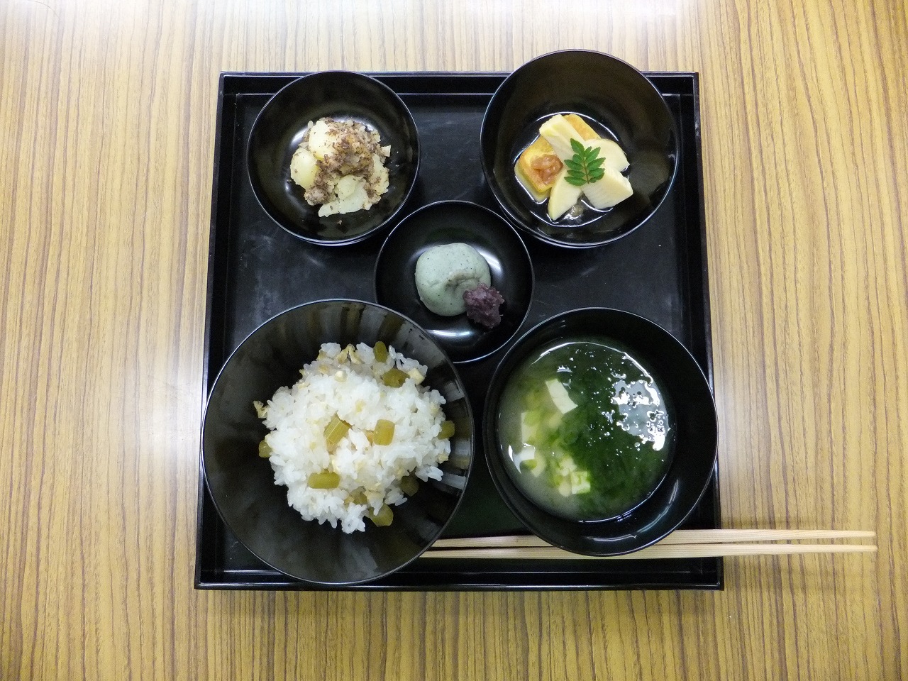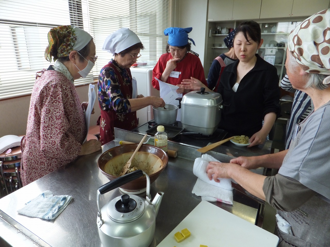 料理好きの12人の参加とあり、みなさんの手際の良さにびっくりです。男性も2人参加してくださいました。 季節の香りあふれる料理に「お楽しみ甘味」の草餅が加わり、上品な一膳ができました。