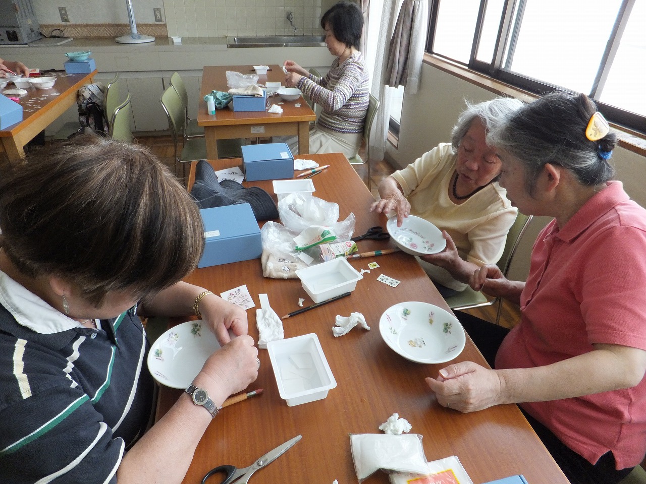 当地区センターで人気の講座です。 今回は、スープ皿にもなるサラダボウルを作りました。 さわやかなハーブの柄や、新柄のシール選びはわくわくします。 親子で参加し、それぞれのオリジナル食器を作る方も増えています。