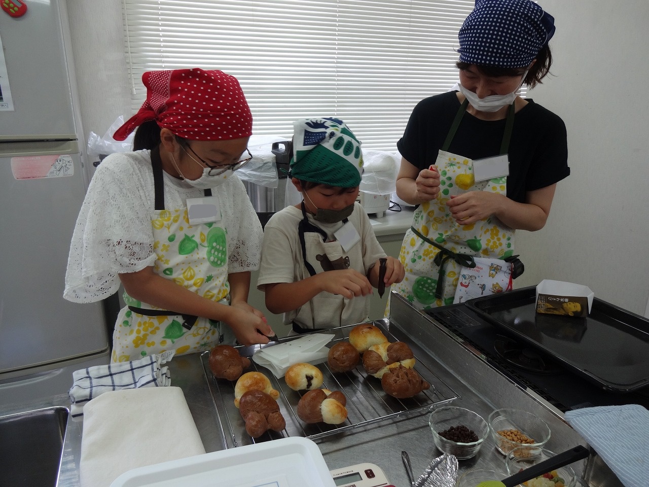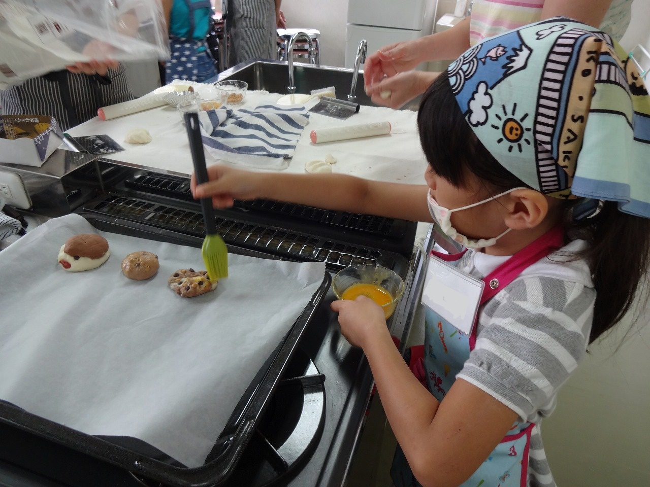 先生からの説明の後、生地を自由に成形し、チョコチップ、チョコペン、ドライフルーツなど多彩なトッピングで、色とりどりのバラエティー豊かなパンが出来ました。 焼き上がりはとっても美味しくて、自然に笑顔がこぼれます。 食べきれないものは、(お留守番のパパへの?!)最高のおみやげになりました!