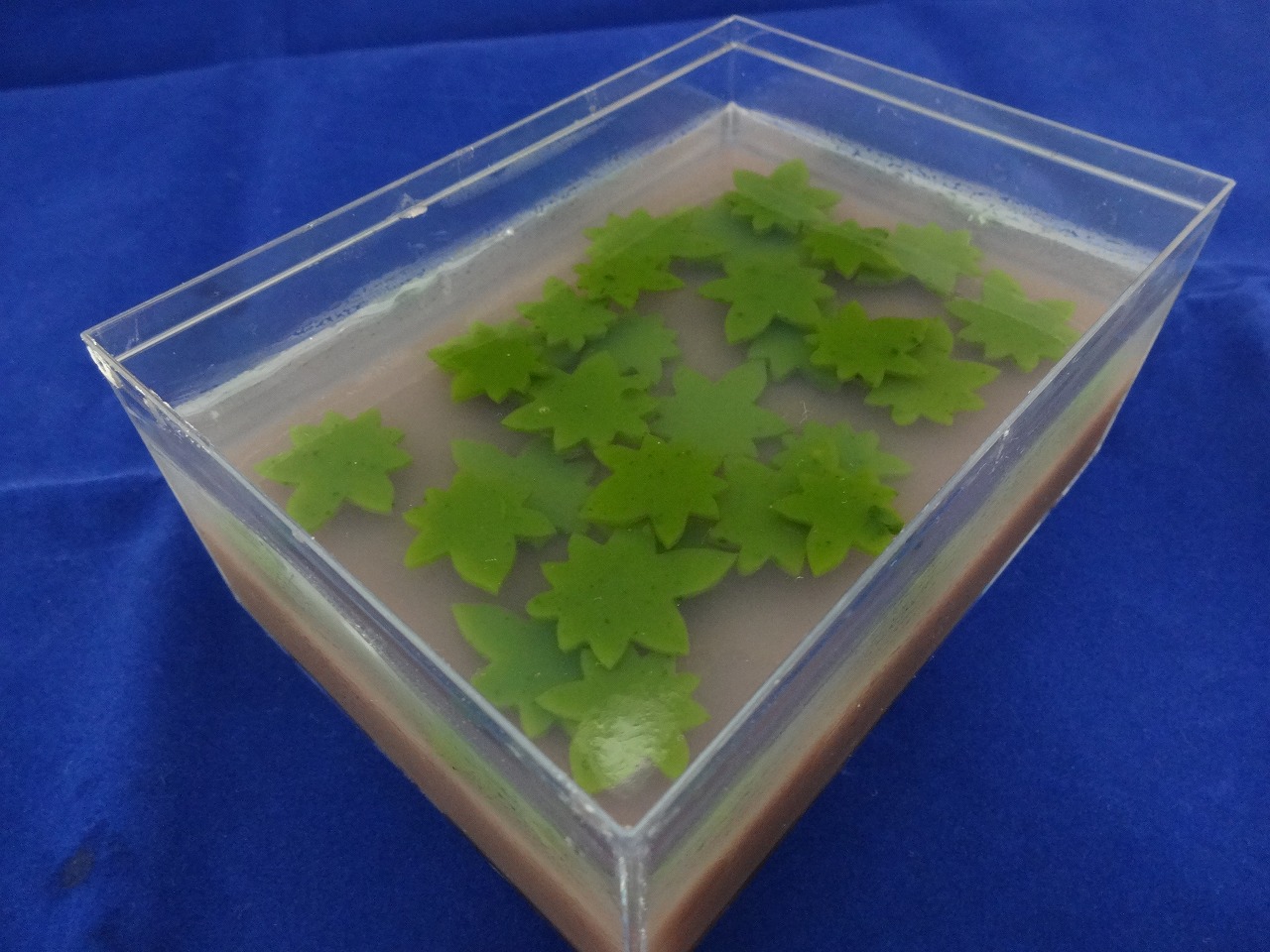 夏の涼しげな和菓子、の今回は「錦玉」です。 こだわりの!小豆を煮るところからの本格手作り。 寒天を型に流し込み、型抜きしたもみじを散らします。 まるで水面に映りこんだかのような、もみじのみどりが美しい、和菓子「錦玉」の出来上がりです。