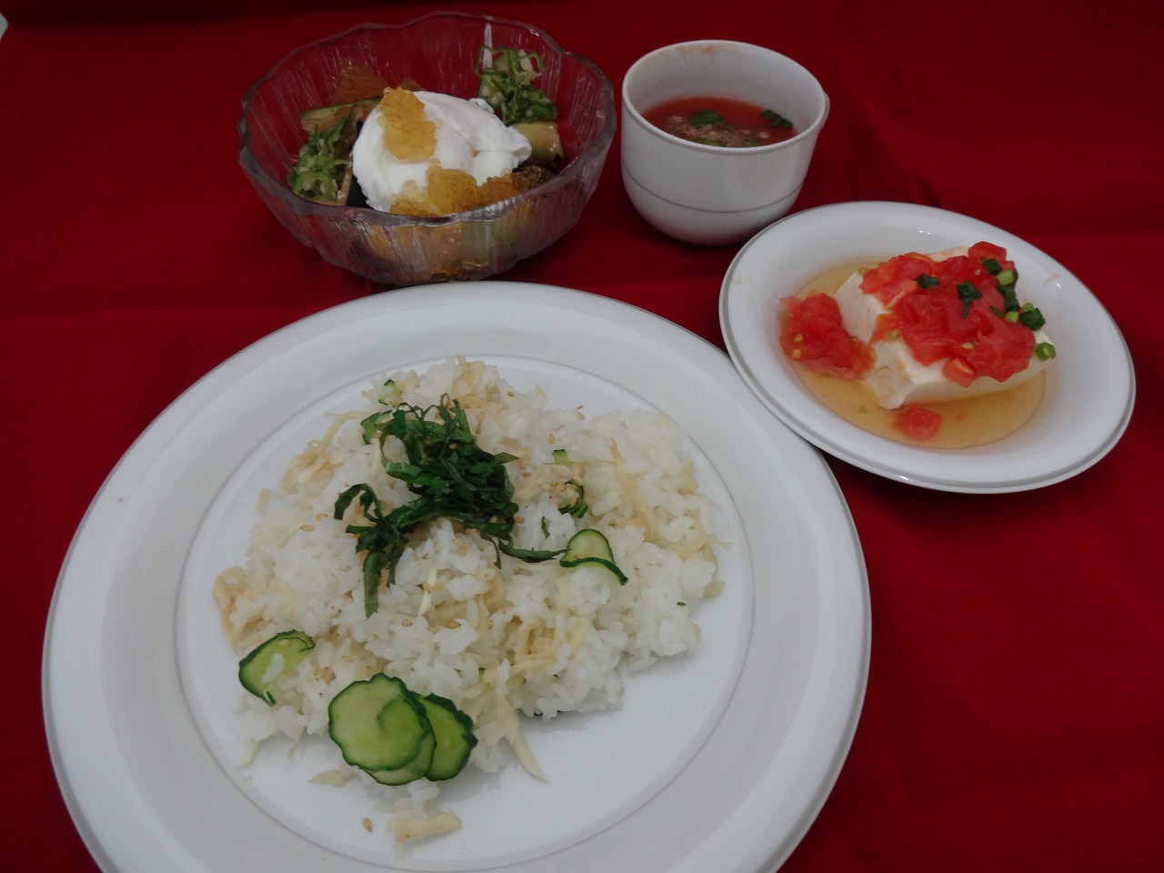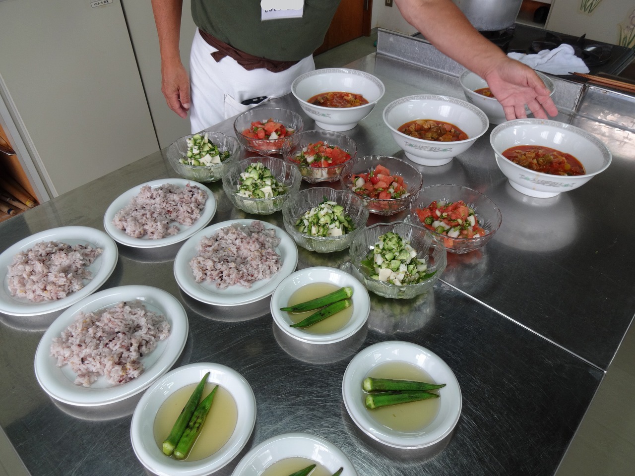 オクラを使った四種の料理を作りました。 メインの「ガンボスープ」はアメリカ ルイジアナ州を起源とする料理だそうで、初めての方にも「おいしい!」と好評でした。 「ガスパチョ風サラダ」は、何と!フルーツを使って、ライムも利かした夏向きのサラダになりました。 野菜を使ったさっぱりとした冷奴は、この夏の定番になることでしょう! 次回もお楽しみに!