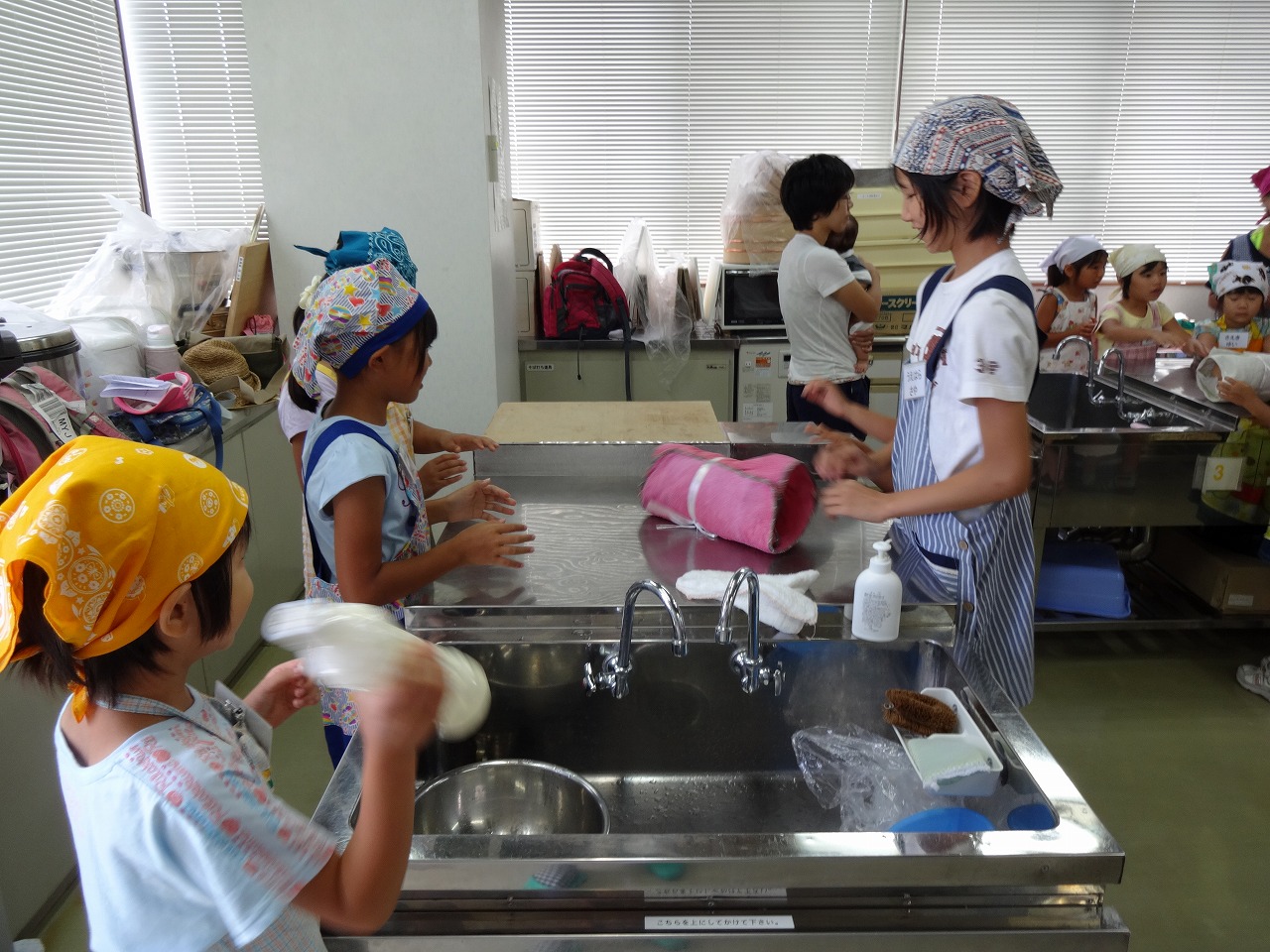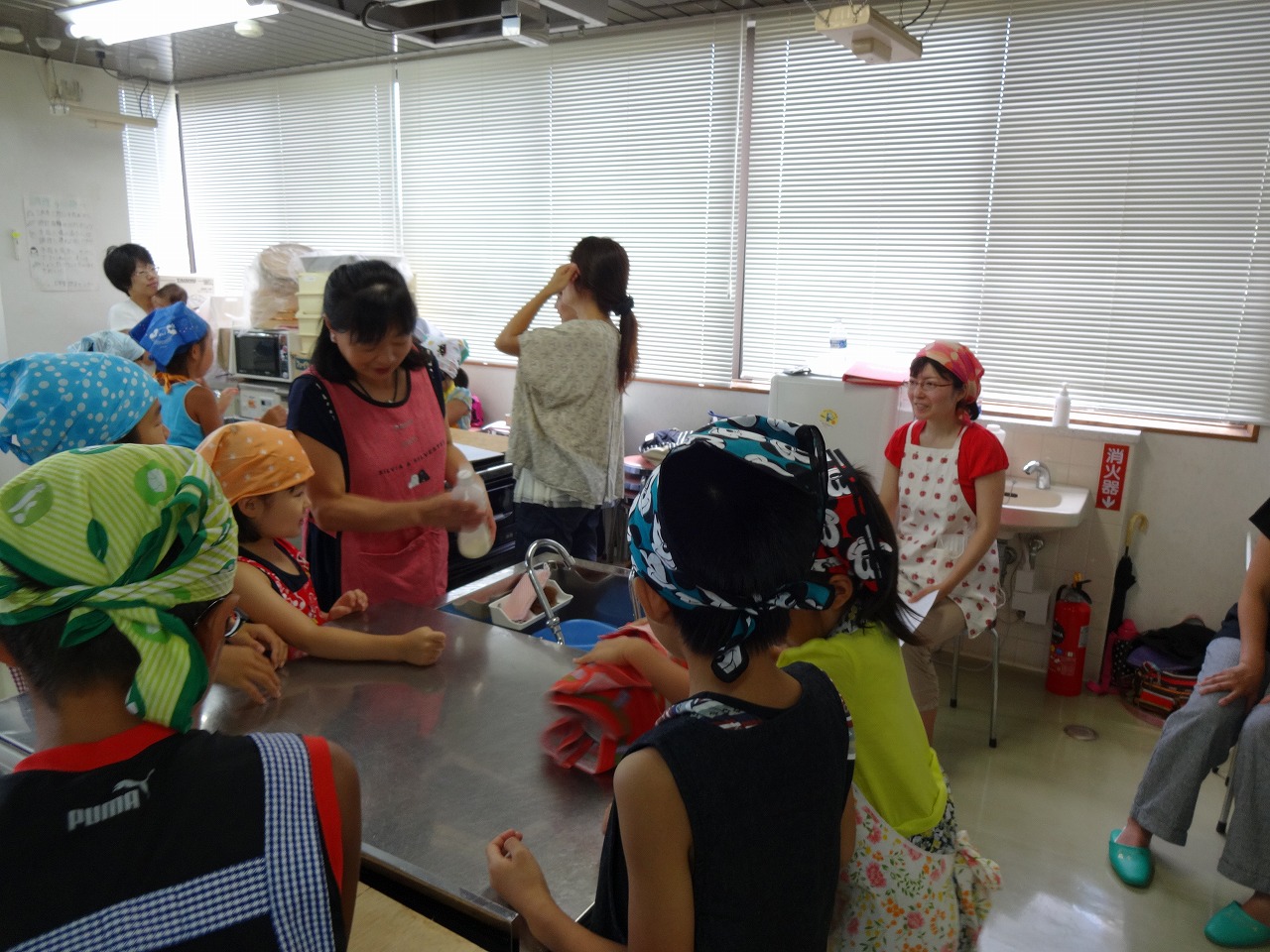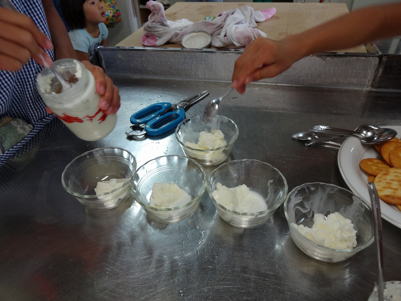 アイスクリーム作りを通して、科学の不思議を体験しました。 2種類以上の物質の組み合わせで得られる冷却剤(寒剤)の実験や、アイスクリームの歴史など・・・。 興味深い話をたくさん聞くことができました。 ミルクの缶に寒剤を作り、アイスクリームの材料を入れたビンを入れてコロコロ転がす時間もわくわく楽しかったです! 生クリームでバターも作り、自然のおいしさを味わいました。