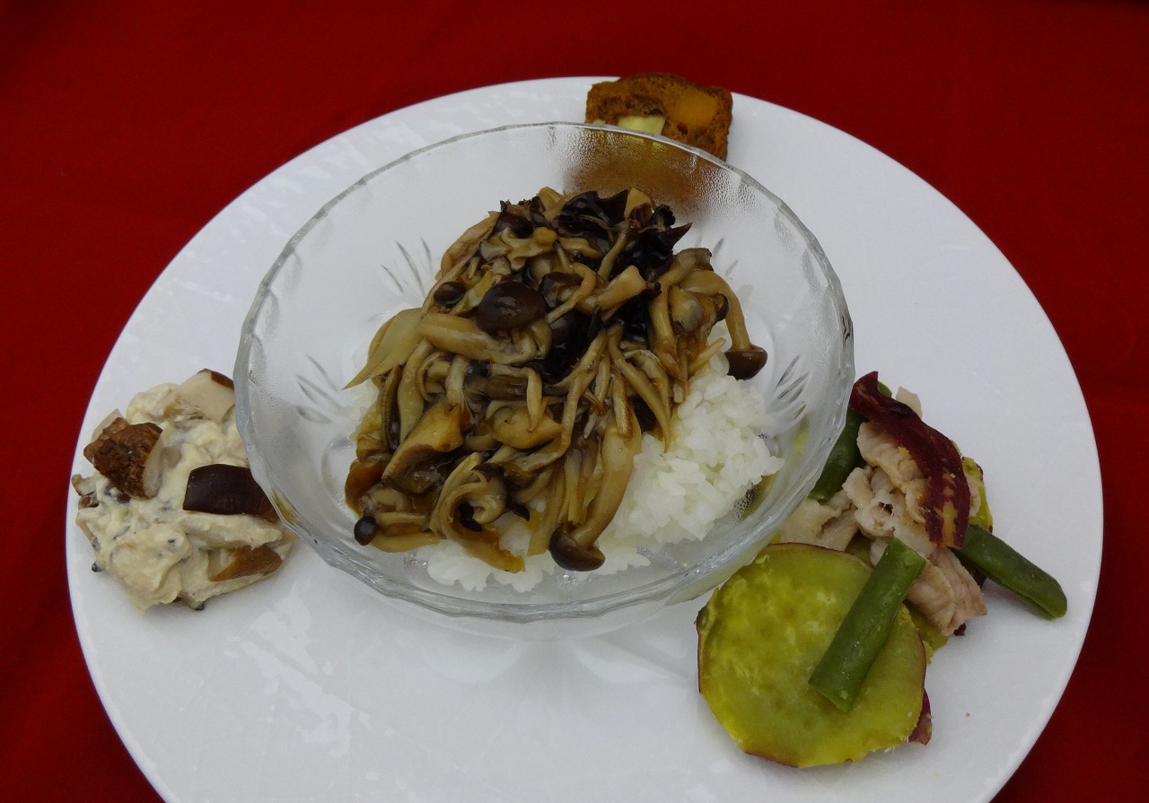 秋の味覚の代表きのこをふんだんに使った「きのことろごはん」と「秋の白和え」、「さつまいもの肉じゃが」で1枚のプレートが秋の香りいっぱいになりました。