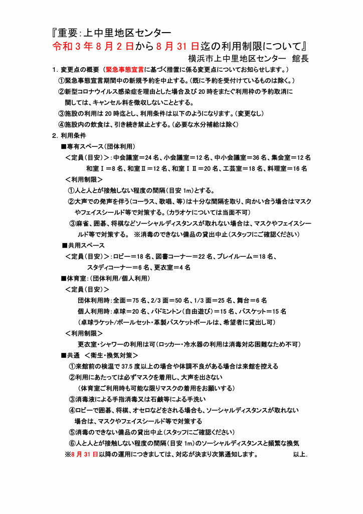 平素は、当館をご利用いただきありがとうございます。標記の件につきまして、横浜市市民局地域施設課より令和3年7月30日付で通知がありました。