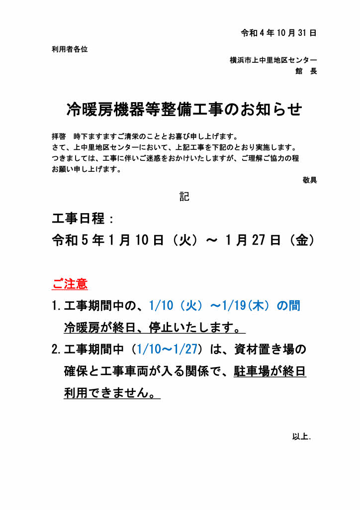 🔷重要🔷冷暖房機等整備工事のお知らせ